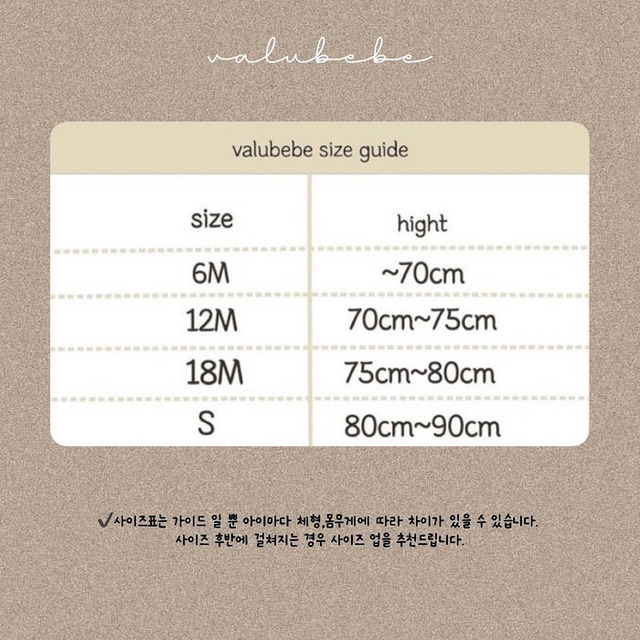 *こちらは予約での取寄商品です *商品のお届けはご購入から約3〜8週間後になります *即納商品と一緒にご注文すると予約商品の入荷を待ってからの発送になりますので、予約と即納は別々でご購入下さい (brand) valubebe (size) 6m,12m,18m (color) brown / beige ✼••┈┈┈┈••✼••┈┈┈┈••✼ 参考サイズ 6M (〜70cm) 12M (70cm~ 75cm) 18M (75cm~80cm) S (80cm~90cm) ✼••┈┈┈┈••✼••┈┈┈┈••✼ *再生産などで生地の色味等が若干変わる場合がございます *メーカー側の都合で ご用意できない場合は キャンセルとさせて頂きます *お客様のご都合での キャンセル・変更は不可です #韓国子供服 #韓国こども服
